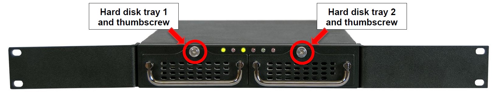 - Loosen the thumbscrew on the front of hard disk tray 2 (see Illustration 1 and Illustration 2 for hard disk and screw locations), remove the tray and insert it into the hard disk 1 bay and secure it by tightening its thumbscrew.