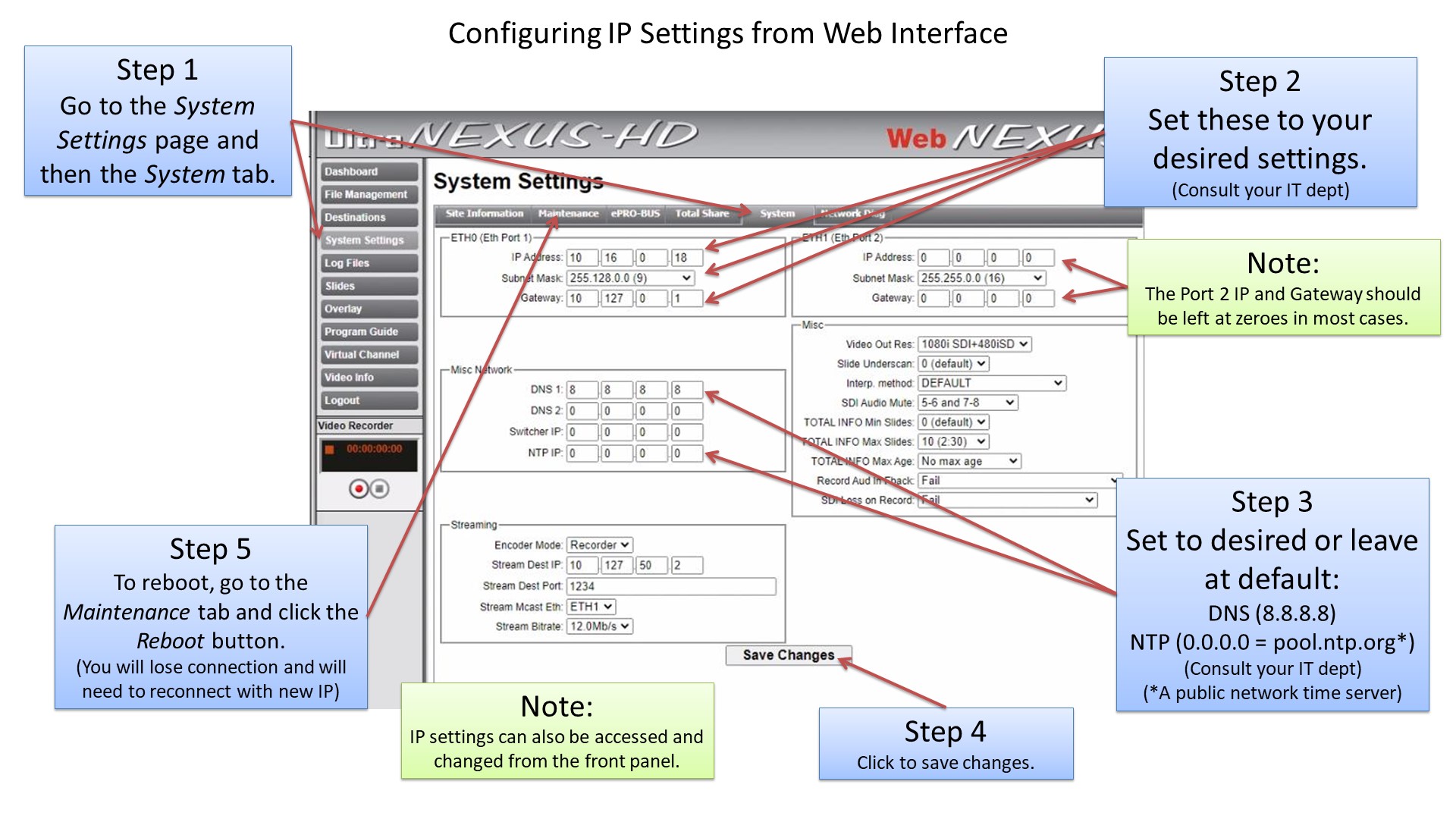 Here is how to configure network settings from the System Settings page of the unit's web interface. This includes setting IP, Subnet mask, Gateway, DNS, and NTP server addresses.
