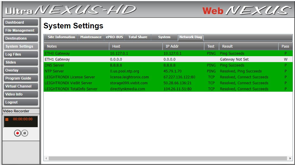 - Check the Network Diag tab on the System Settings page of the browser interface of the UltraNEXUS-HD.