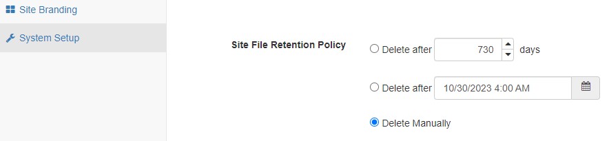 - The simplest option would be, for example, if you want files to automatically delete two years after they are uploaded, set the Site Retention Policy (set on the VieBit System Setup page) to "Delete after 730 days" and leave all the other Folder and File retention settings alone (set to Site).